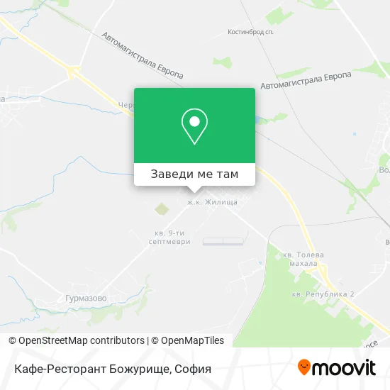 Moovit предоставя безплатни карти и навигации на живо, за да ви помогне да навигирате във вашия град. Преглеждайте графици, маршрути, разписания и разберете колко време отнема да стигнете до Кафе-Ресторант Божурище в реално време.