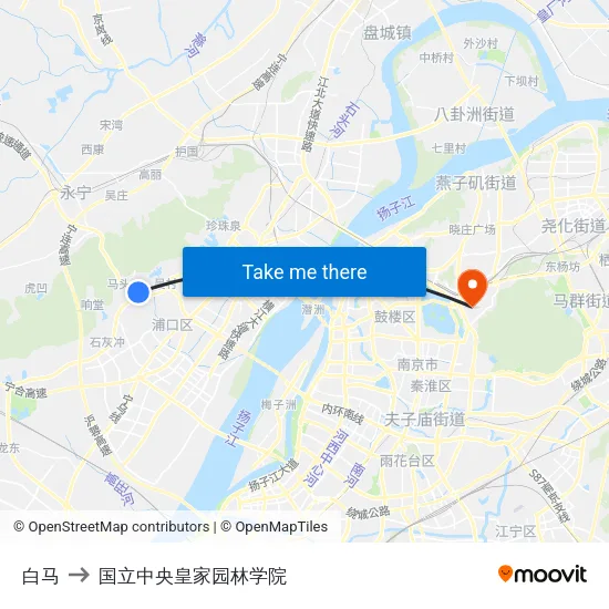 The total travel time between 白马 in 浦口区 and 国立中央皇家园林学院 in 玄武区 by bus and metro is about 1 hr 12 min.
