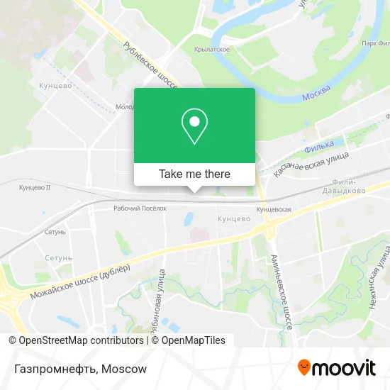 The nearest metro station to Газпромнефть in Moscow is Кунцевская (Kuntsevskaya). It’s a 24 min walk away.