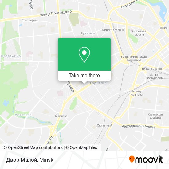 Looking for the nearest stop or station to Двор Малой? Check out this list of stops closest to your destination: Ст.М. Грушаўка; Грушевка; Беліта-Вітэкс; Грушаўская; Карпава; Глаголева.