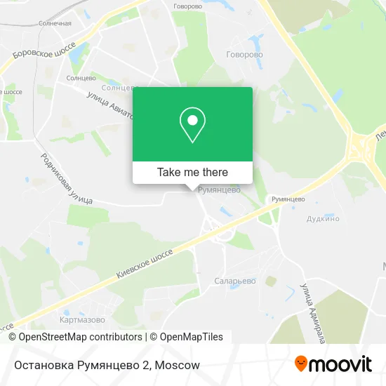 For information on prices of bus, metro and train, costs and ride fares to Остановка Румянцево 2, please check the Moovit app.