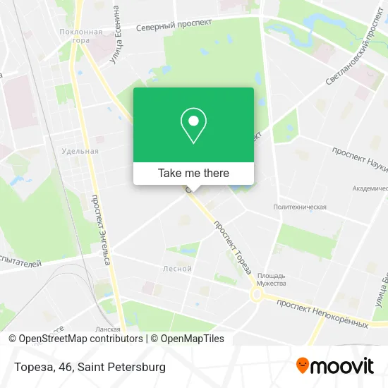Wondering how to get to Тореза, 46 in Выборгский Район? Moovit helps you find the best way to get to Тореза, 46 with step-by-step directions from the nearest public transit station.