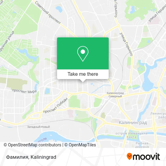 We make riding to Фамилия easy, which is why over 1.5 million users, including users in Kaliningrad, trust Moovit as the best app for public transit. You don’t need to download an individual bus app or train app, Moovit is your all-in-one transit app that helps you find the best bus time or train time available.