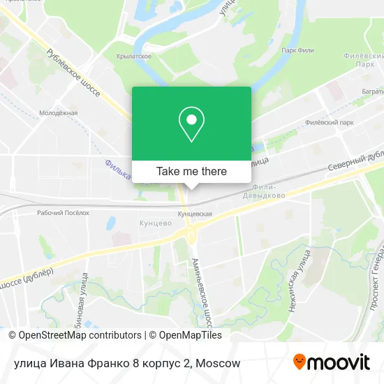 The nearest metro station to улица Ивана Франко 8 корпус 2 in Фили-Давыдково is Кунцевская (Kuntsevskaya). It’s a 5 min walk away.