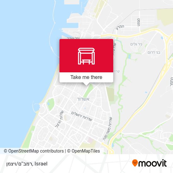 The nearest bus station to רמב''ם/ויצמן in אשדוד is רמב''ם/שד. הנשיא וייצמן. It’s a 1 min walk away.