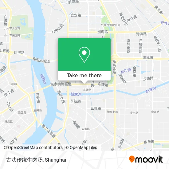 Looking for the nearest stop or station to 古法传统牛肉汤? Check out this list of stops closest to your destination: 东靖路张杨北路; 东高路张杨北路; 东靖路 Dongjing Road; 东煦路张杨北路; 浦东北路东靖路; 东波路张杨北路; 巨峰路 Jufeng Road.
