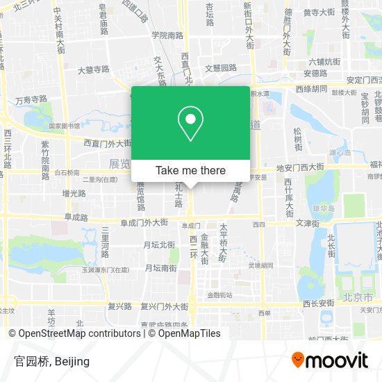 Looking for the nearest stop or station to 官园桥? Check out this list of stops closest to your destination: 车公庄南; 马尾沟; 阜成门北; 阜成门内; 车公庄东; 车公庄西(车公庄大街); 平安里 Ping'An Li; 车公庄 Chegongzhuang; 西直门 Xizhi Men.