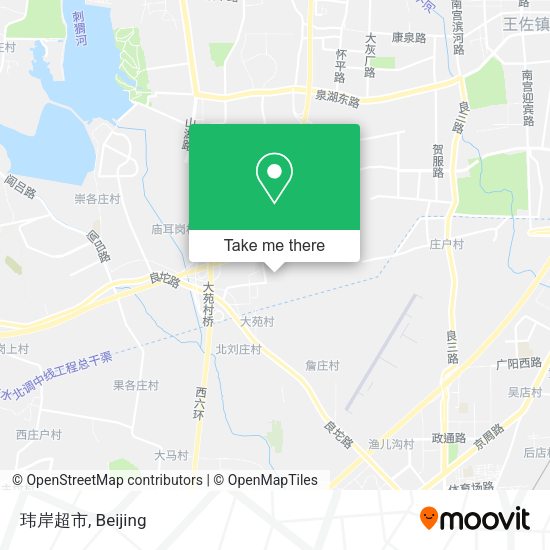 Looking for the nearest stop or station to 玮岸超市? Check out this list of stops closest to your destination: 大苑村东; 大苑村; 阎村东 Yancun Dong (E).