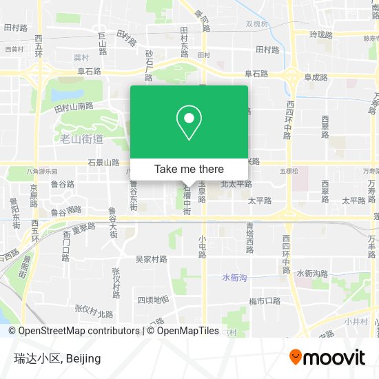 Looking for the nearest stop or station to 瑞达小区? Check out this list of stops closest to your destination: 鲁谷路东口; 十院; 五棵松 Wukesong; 石槽; 玉泉路口南; 田村 Tiancun.