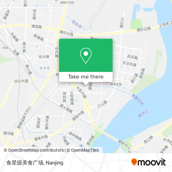 The nearest metro station to 食星级美食广场 in 浦口区 is 柳洲东路. It’s a 15 min walk away.