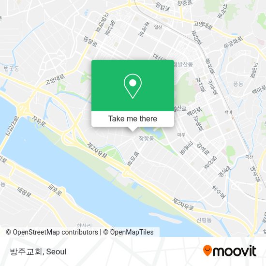 The nearest subway station to 방주교회 in 고양시, 경기도 is 정발산 Jeongbalsan. It’s a 24 min walk away.
