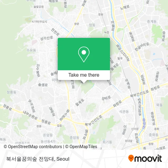 Wondering how to get to 북서울꿈의숲 전망대 in 강북구, 서울시? Moovit helps you find the best way to get to 북서울꿈의숲 전망대 with step-by-step directions from the nearest public transit station.