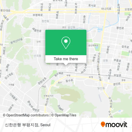 For information on prices of subway and bus, costs and ride fares to 신한은행 부평지점, please check the Moovit app.