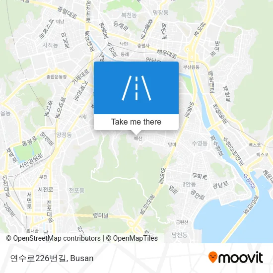 The nearest metro station to 연수로226번길 in 연제구 is 배산. It’s a 2 min walk away.