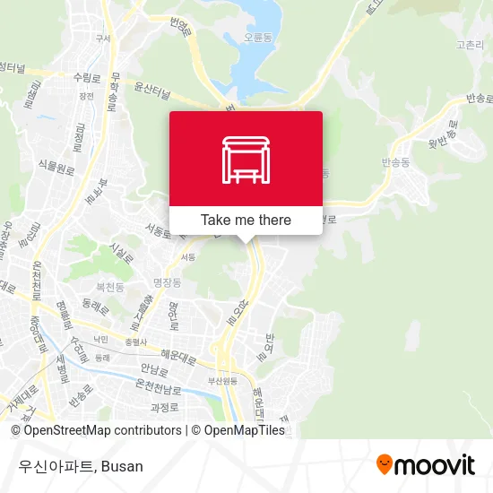 Looking for the nearest stops closest to 우신아파트 ? Check out this list of closest stops to your destination: 신동아파트정문; 금사; 서금지구대; 금사전화국; 석대사거리; 반여농산물도매시장 동문.