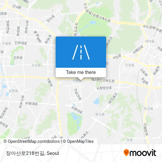 The nearest bus station to 장아산로218번길 in 남동구, 인천시 is 서창Jc(경유). It’s a 15 min walk away.