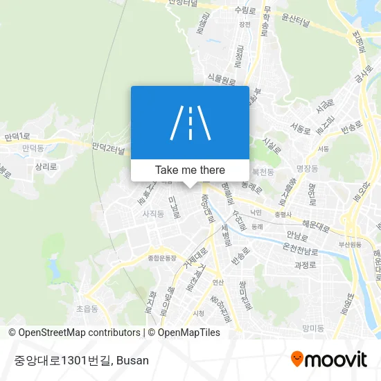 Looking for the nearest stop or station to 중앙대로1301번길? Check out this list of closest stops available to your destination: 미남; 사직성당; 동래역; 동래럭키아파트; 광혜병원; 미남교차로; 동래역환승센터; 동래.