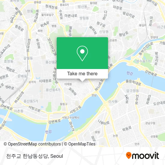 We make riding to 천주교 한남동성당 easy, which is why over 1.5 million users, including users in 용산구, 서울시, trust Moovit as the best app for public transit. You don’t need to download an individual bus app or train app, Moovit is your all-in-one transit app that helps you find the best bus time or train time available.