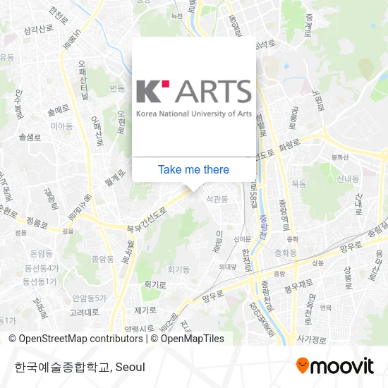 We make riding to 한국예술종합학교 easy, which is why over 1.5 million users, including users in 성북구, 서울시, trust Moovit as the best app for public transit. You don’t need to download an individual bus app or train app, Moovit is your all-in-one transit app that helps you find the best bus time or train time available.