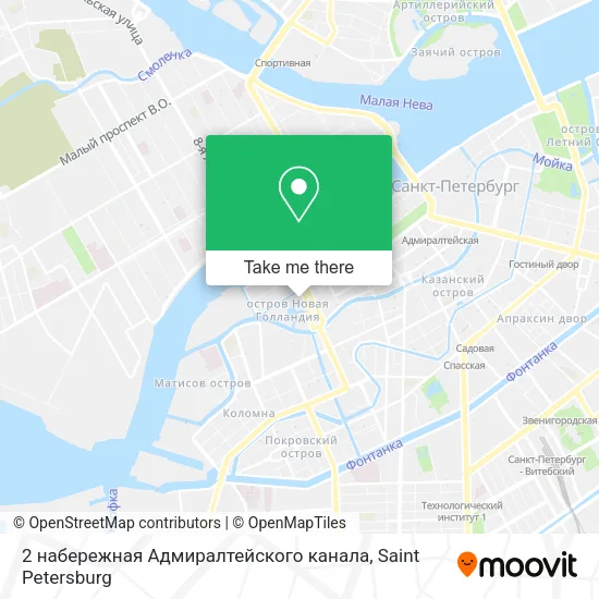 Wondering how to get to 2 набережная Адмиралтейского канала in Санкт-Петербург? Moovit helps you find the best way to get to 2 набережная Адмиралтейского канала with step-by-step directions from the nearest public transit station.