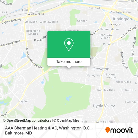 Looking for the nearest stop or station to AAA Sherman Heating & AC? Check out this list of stops closest to your destination: Vantage Dr @ Rock Creek Rd; Telegraph Rd @ Rose Hill Dr; Van Dorn Street Metro Station; Eisenhower Ave Metrorail Station.