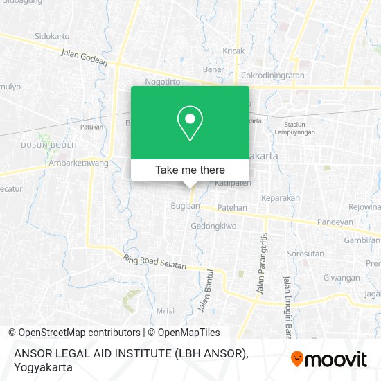 Looking for the nearest stop or station to ANSOR LEGAL AID INSTITUTE (LBH ANSOR)? Check out this list of stops closest to your destination: Tpb - Pasar Legi; Tpb - Muallimin; Jalan Kapten Piere Tendean 50a; Halte - Tejokusuman (Taman Sari); Patukan; Lempuyangan; Stasiun Yogyakarta.