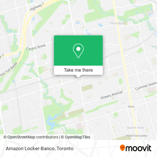 Looking for the nearest stop or station to Amazon Locker-Banco? Check out this list of stops closest to your destination: Carpenter Rd at Steeles Ave West; Steeles Ave West at Carpenter Rd West Side; Steeles Ave West at Carpenter Rd; Bathurst St at Steeles Ave West; Bathurst St / Steeles Av; Steeles Av / Bathurst St; Finch West Station; Sheppard - Yonge.