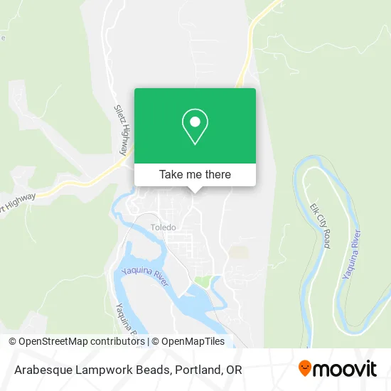 The nearest bus station to Arabesque Lampwork Beads in Portland, OR is Toledo Jc Thriftway. It’s a 9 min walk away.