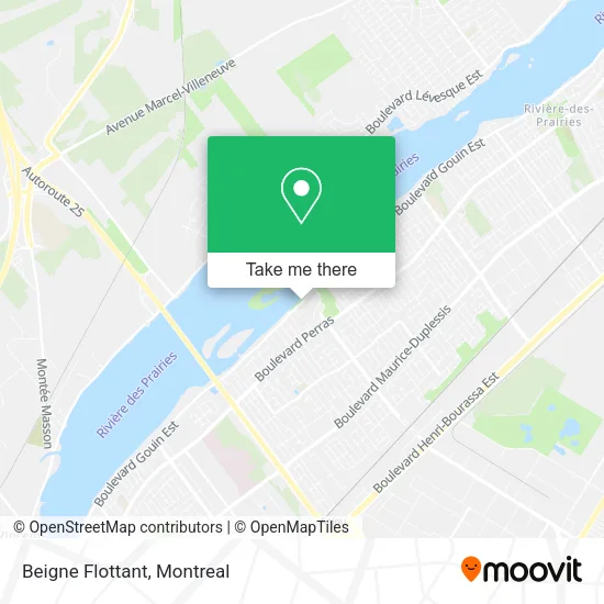 The nearest bus stations to Beigne Flottant in Montreal are 26e Avenue / Gouin and Armand-Bombardier / Perras. The closest one is a 7 min walk away.