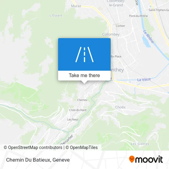 The nearest bus station to Chemin Du Batieux in Geneve is Collombey, Les Neyres Chapelle. It’s a 10 min walk away.