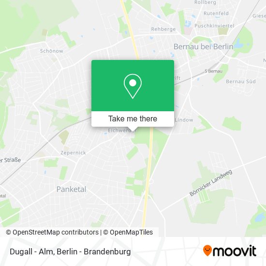 Looking for the nearest stop or station to Dugall - Alm? Check out this list of stops closest to your destination: Zepernick Malzmühle; Zepernick Schumannstr.; Bernau Abzweig Wohnsiedlung; S Zepernick; S Bernau Bhf.