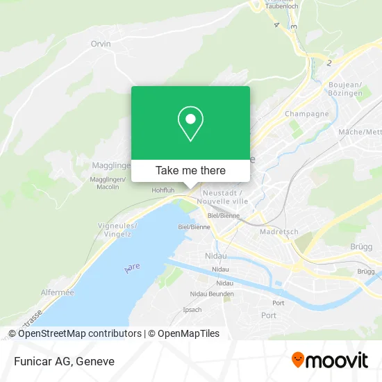 Looking for the nearest stop or station to Funicar AG? Check out this list of stops closest to your destination: Biel/Bienne; Biel/Bienne; Biel/Bienne; Biel/Bienne; Biel/Bienne; Biel/Bienne; Biel/Bienne; Biel/Bienne; Biel/Bienne (Schiff/Bateau); Biel/Bienne Leubringenb.(Funi); Biel/Bienne Hohfluh.