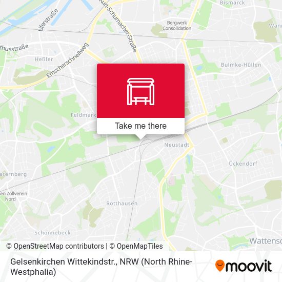 The nearest bus station to Gelsenkirchen Wittekindstr. is Gelsenkirchen Wittekindstr.. It’s a 1 min walk away.