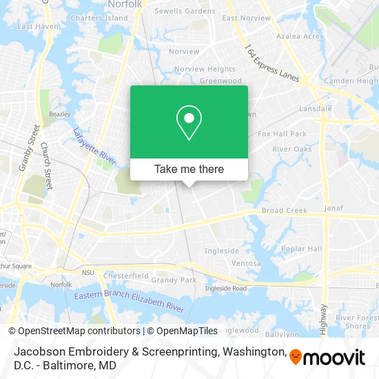 We make riding to Jacobson Embroidery & Screenprinting easy, which is why over 1.5 million users, including users in Norfolk, trust Moovit as the best app for public transit. You don’t need to download an individual bus app or train app, Moovit is your all-in-one transit app that helps you find the best bus time or train time available.