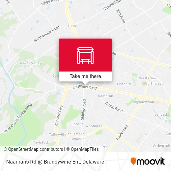 The nearest bus stations to Naamans Rd @ Brandywine Ent in Delaware are Shipley Rd @ Granite Way, Naamans Rd @ Op Shopping Ctr and Brandywne Twn Ct @ Op Community Ctr. The closest one is a 4 min walk away.