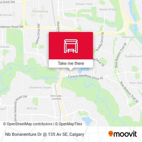 The nearest bus stations to Nb Bonaventure Dr @ 135 Av SE in Calgary are Nb Lake Fraser Dr @ N. Of Canyon Meadows Dr SE and Sb Bonaventre Dr @ 135 Av SE. The closest one is a 3 min walk away.
