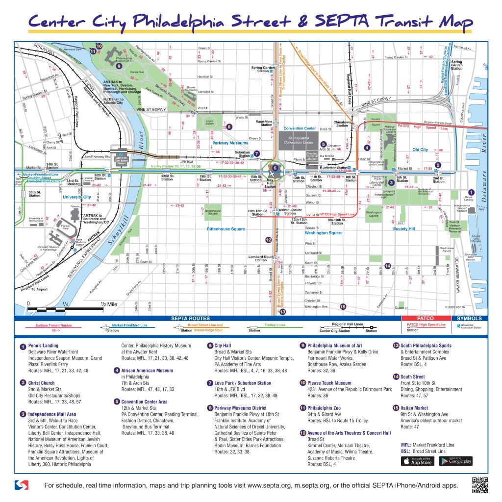 Moovit has an easy-to-download SEPTA City Center Transit map, that serves as your offline Philadelphia metro, bus or train map while traveling. This map can be saved in your phone and it’s easy to share with friends. To view the downloaded map, no internet connection is required. It’s the offline metro, bus or train map in Philadelphia that will take you where you need to go.