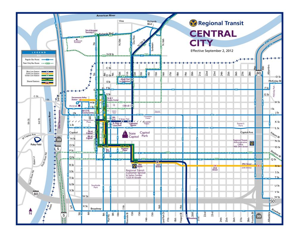 Moovit has an easy-to-download Sacramento SRTD Central City Map, that serves as your offline Sacramento light rail map while traveling. This map can be saved in your phone and it’s easy to share with friends. To view the downloaded map, no internet connection is required. It’s the offline light rail map in Sacramento that will take you where you need to go.