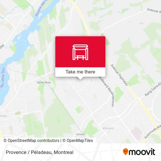 The nearest bus station to Provence / Péladeau in Laval is Des Laurentides / Des Lacasse. It’s a 10 min walk away.