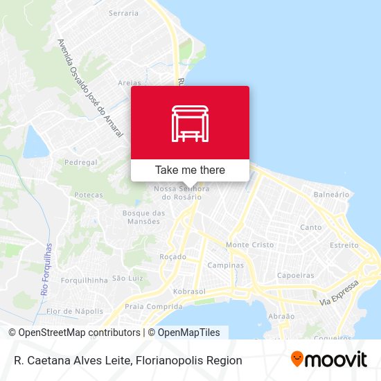 These bus lines stop near R. Caetana Alves Leite: 12400 SHOPPING CENTER, 1330 NOVA PALHOÇA/BIGUAÇU VIA MARGINAL BR 101 (HORÁRIOS COMPARTILHADOS), 1333 NOVA PALHOÇA/BIGUAÇU VIA MARGINAL BR 101 (EXECUTIVO), 2200 FLORESTA VIA KOBRASOL, 328 CEASA SANTOS SARAIVA VIA KOBRASOL, 8800 BIGUAÇU / PALHOÇA VIA BR 101.