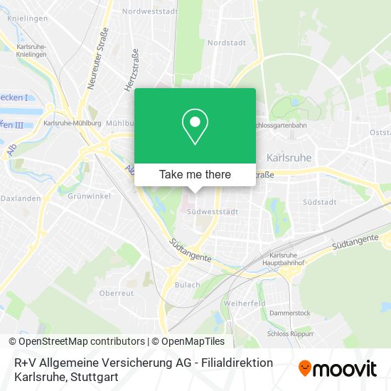 Wondering how to get to R+V Allgemeine Versicherung AG - Filialdirektion Karlsruhe in Stuttgart? Moovit helps you find the best way to get to R+V Allgemeine Versicherung AG - Filialdirektion Karlsruhe with step-by-step directions from the nearest public transit station.