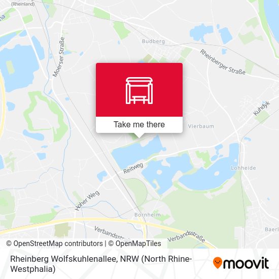 The nearest bus station to Rheinberg Wolfskuhlenallee is Rheinberg Vierbaumer Heide. It’s a 9 min walk away.