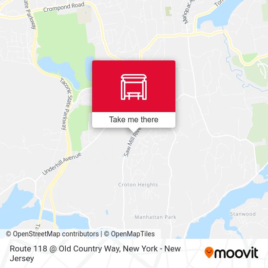 The nearest bus station to Route 118 @ Old Country Way in Yorktown is Saw Mill River Rd @ Old Country Way. It’s a 1 min walk away.