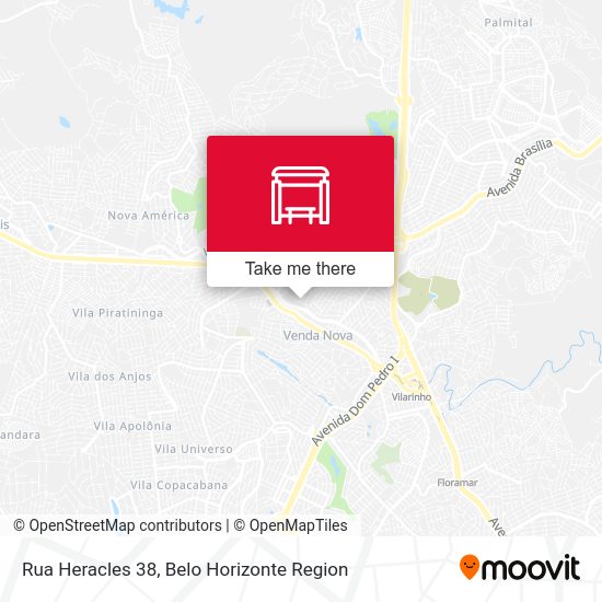 The nearest metro station to Rua Heracles 38 in Belo Horizonte is Estação Vilarinho. It’s a 23 min walk away.