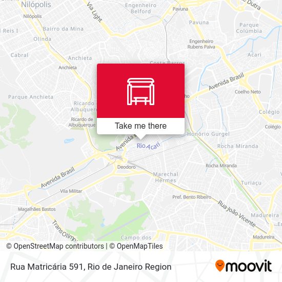 Looking for the nearest stops closest to Rua Matricária 591 ? Check out this list of closest stops to your destination: Estrada Do Camboatá / Subida Da Brasil; Avenida Brasil; Deodoro; Avenida Brasil - Passarela 31 (2 - Sentido Itaguaí / Seropédica); Avenida Brasil | Passarela 31; Guadalupe; Rua Massenet 397; Honório Gurgel.