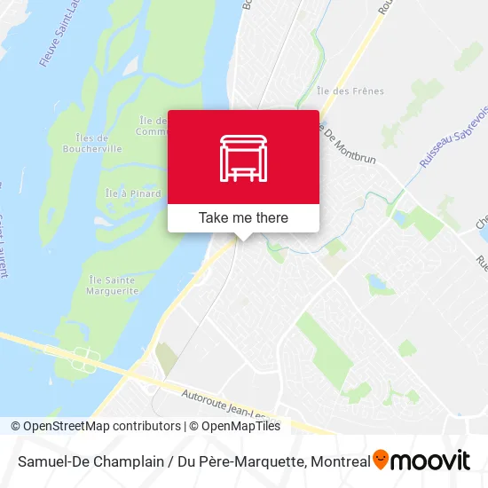 The nearest bus station to Samuel-De Champlain / Du Père-Marquette in Montreal is Samuel-De Champlain / Du Père-Marquette. It’s a 1 min walk away.