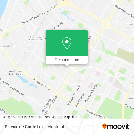 Looking for the nearest stop or station to Service de Garde Lexa? Check out this list of stops closest to your destination: Jarry / Fleuricourt; Lacordaire / Jarry; Métropolitain / Lacordaire; Station Cadillac; Station Saint-Michel; Gare Saint-Léonard-Montréal-Nord.