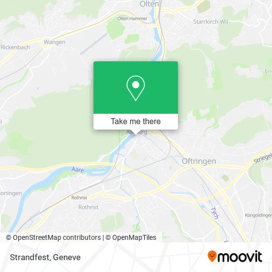 Looking for the nearest stop or station to Strandfest? Check out this list of stops closest to your destination: Aarburg; Aarburg; Aarburg-Oftringen; Olten Hammer; Rothrist; Aarburg-Oftringen; Olten.