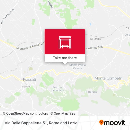 Looking for the nearest stops closest to 51 Cappellette Street ? Check out this list of closest stops to your destination: 11 Cappellette Street; Monte Porzio | Frascati St Coppellette St; Via Frascati Antica; Monte Porzio | Frascati Road (Observatory); Monte Porzio | Colonna Road Fontana Candida Road; Frascati | Via Colonna Via Colle Pisano; Frascati; P. Martini Avenue; Colle Mattia.
