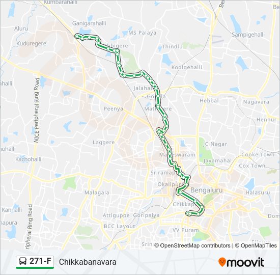 Track line 271-F (Chikkabanavara) on a live map in real time and follow its location as it moves between stations. Check its running status to see if it's on time or delayed. Use Moovit as a line 271-F bus tracker or a live BMTC (Bengaluru Metropolitan Transport Corporation) bus tracker app and never miss your bus.